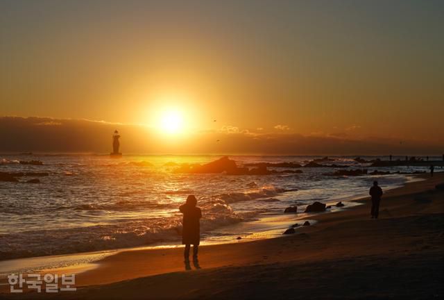동해시 어달해변 일출. 인근 망상해변이 거칠 것 없이 넓은 모래사장과 탁 트인 바다 풍광을 자랑하는데 비해 어달해변 일출은 등대, 갯바위 등과 어우러져 한결 생동감이 있다. |
