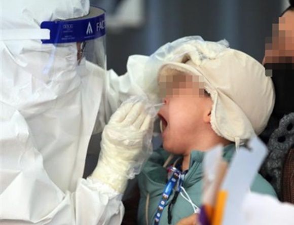 지난 5일 서울역 코로나19 임시 선별진료소에서 한 아이가 검체 채취를 받고 있다. 본문과 직접 관련 없음. 연합뉴스