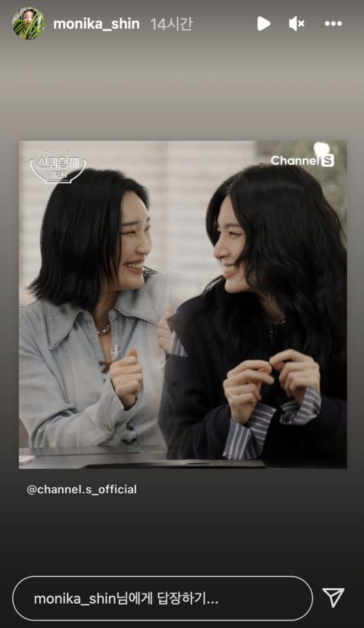 모니카는 6일 자신의 인스타그램 스토리에 채널S ‘신과 함께2’ 스틸을 올렸다. 사진 속 그는 립제이를 바라보며 사랑스러운 눈웃음을 짓고 있다. 립제이 역시 존경하는 언니를 보며 활짝 웃고 있다.