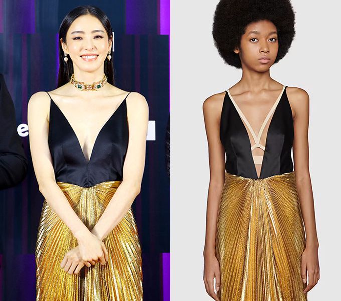 이다희가 착용한 드레스는 가느다란 스트랩으로 연결된 블랙 실크 새틴 톱에 화려한 금빛 주름 스커트가 더해진 디자인으로, 가슴과 등 라인을 가로지르는 베이지색 하네스 디테일이 더해진 것이 특징이다.