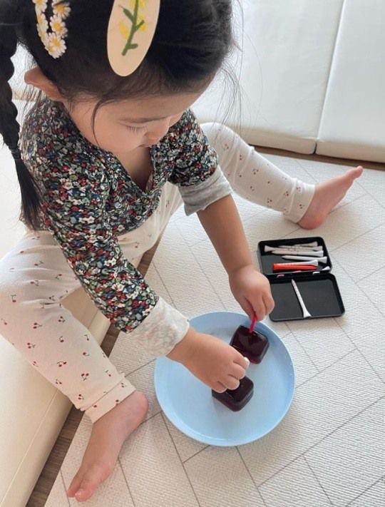그는 이와 함께 한지우의 딸이 곤약젤리를 가지고 노는 모습이 담긴 사진을 게재했다. 딸 이음이는 곤약젤리에 빠져 재밌게 놀고 있다.