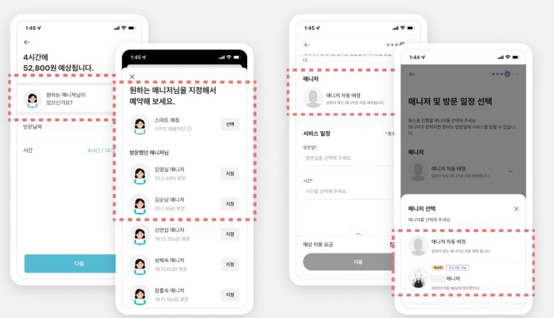 생활연구소 측은 자신들의 앱인 청소연구소에 적용된 각종 UI·UX 등이 LG 홈인에도 다수 적용됐다고 주장하고 있다. 왼쪽은 생활연구소, 오른쪽은 LG 홈인의 앱 내 모습. [사진=생활연구소] |