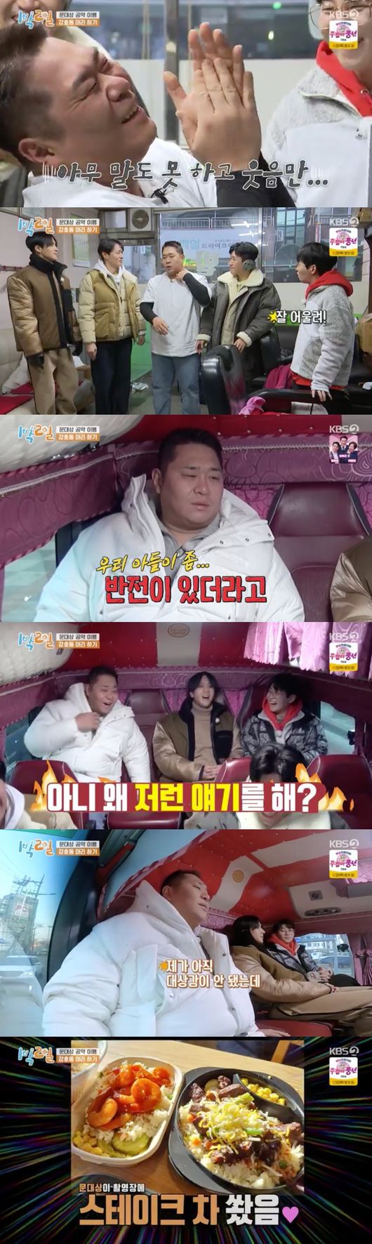 이어 딘딘은 최근에 문세윤이 출연 중인 tvN ‘놀라운 토요일’에 게스트로 나간 이야기를 하며 “상은 여기서 받았는데 ‘놀토’ 스피커를 바꿔준다고 하더라”며 폭로해 문세윤을 당황케 했다. 이에 멤버들은 ‘1박2일’에도 해달라며 목소리를 높였다. 문세윤은 “그냥 말한 것이다. 대상 깜냥이 아직 안되는데 운을 당겨 받은 것 같다”고 겸손하게 말했다. 제작진에 따르면 문세윤은 ‘1박2일’에 스테이크 차를 쐈다고.