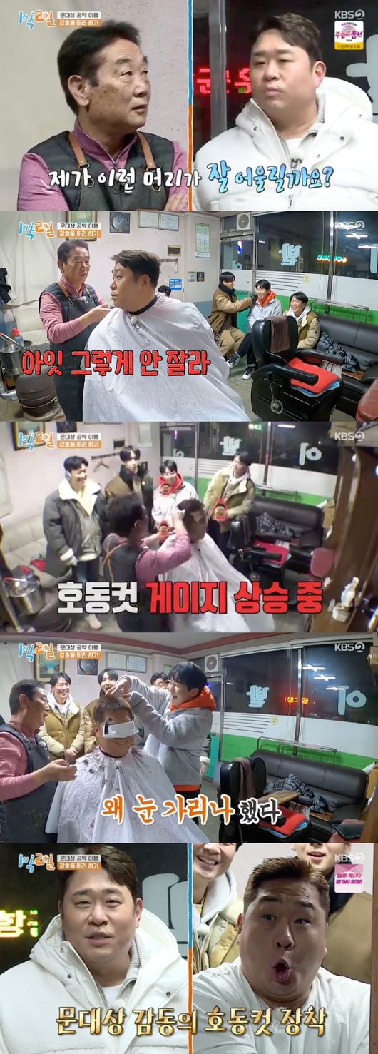 드디어 강호동의 트레이드 마크인 스포츠 머리가 완성됐고, 거울을 본 문세윤은 어색함에 말도 못하고 웃기만 했다. 이에 멤버들은 “생각보다 잘 어울린다. 인물이 훤해보인다”고 칭찬했다. 문세윤은 “생각보다 괜찮다. 좋다. 왠지 논산 가는 느낌이 있다”고 소감을 밝혔다.