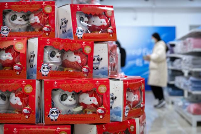 중국 베이징동계올림픽 선수촌 기념품 가게에 기념품들이 가득 쌓여 있다. 베이징=AP 뉴시스. |
