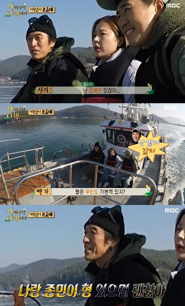 17일 방송된 MBC '안싸우면 다행이야'에는 코요태 김종민, 신지, 빽가의 무인도 생활이 공개됐다.