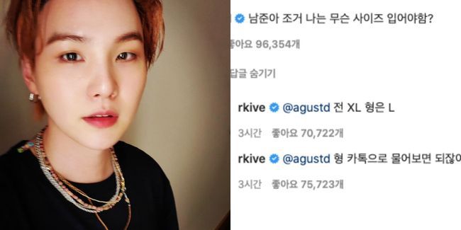 이에 RM은 '전 XL 형은 L 형 카톡으로 물어보면 되잖아요 ㅋㅋㅋㅋ'라고 대댓글을 달아 웃음을 자아냈다. 둘의 티키타카 댓글에 팬들의 이목이 집중됐다.