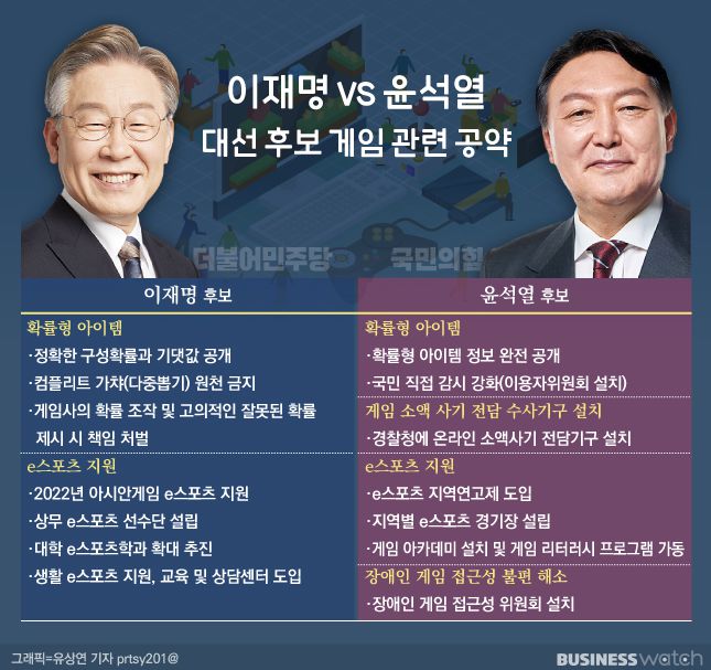 윤 후보 역시 지난 12일 게임산업 발전 공약을 발표하면서 확률형 아이템 정보를 공개하겠다고 했다. 또 방송사의 시청자위원회와 같은 조직을 만들어 국민이 게임사를 직접 감시할 수 있는 시스템을 만들겠다고 밝혔다.