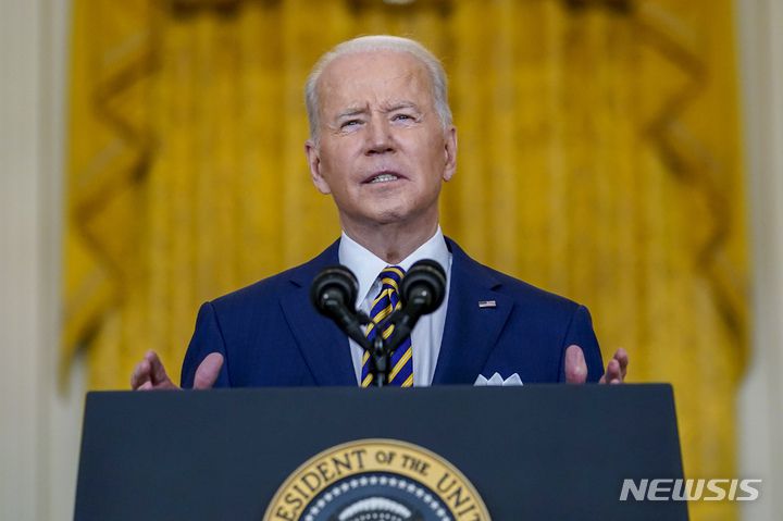 [워싱턴=AP/뉴시스]조 바이든 미국 대통령이 19일(현지시간) 백악관에서 기자회견을 하고 있다. 2022.01.19.