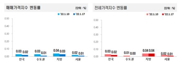 20일 한국부동산원의 주간아파트 가격동향에 따르면 1월 셋째주(17일 기준) 서울 아파트 매매가격 상승률은 이전주 상승률(0.02%)에서 0.01%로 0.01%포인트 하락했다. 수도권은 0.03%에서 0.01%로 0.02%포인트, 지방은 0.04%에서 0.03%로 0.01%포인트 하락했다. 전국 기준으로 0.03%에서 0.02%로 줄었다.