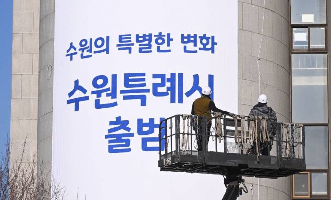 [수원=뉴시스 김종택기자 = 12일 오후 경기도 수원시청에서 관계자들이 '특례시' 공식 출범을 알리는 현수막을 내걸고 있다. 인구 100만이 넘는 경기 수원·고양·용인시, 경남 창원시 등 전국 4곳에서 13일 '특례시'가 공식 출범한다. 특례시는 기초지방자치단체 지위는 유지하되 도시 규모에 걸맞은 행정, 재정적 권한을 가지는 새 유형의 지방자치단체이다. 2022.01.12.
