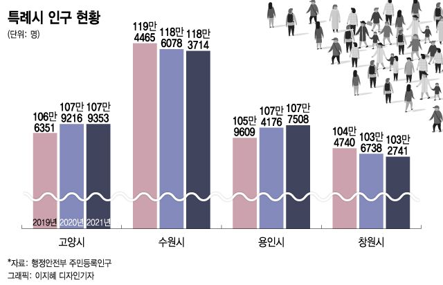 4개 특례시는 아직까지 이 기준에서 여유가 있다. 지난해 말 기준 경기도 수원시의 주민등록인구는 118만3714명이다. 경기도 고양시와 용인시의 주민등록인구는 각각 107만9353명, 107만7508명이다. 특히 고양시와 용인시의 인구는 최근 꾸준히 증가하고 있는 추세다.