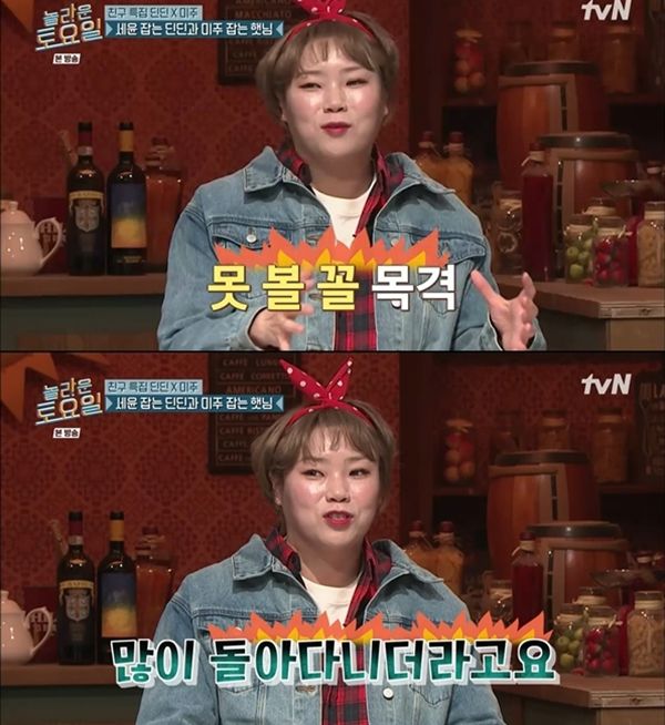 22일 방송된 tvN 예능프로그Žc '놀라운 토요일'(이하 '놀토')에 그룹 러블리즈 출신 미주와 래퍼 딘딘이 등장했다.