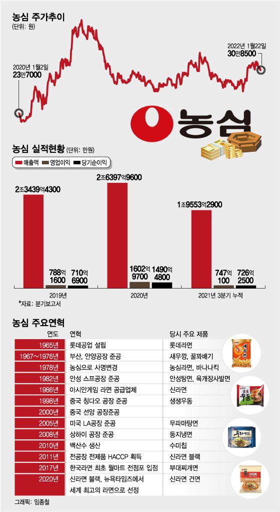 때 마침 농심의 해외 생산기지 및 판매법인이 크게 확충된 상태다. 시기별로 △1996년 중국 상하이 △1998년 중국 칭다오 △2000년 중국 선양 △2005년 미국 LA 등에 공장이 세워졌다.