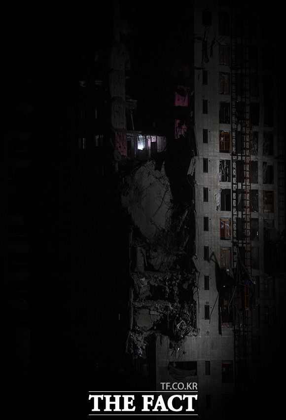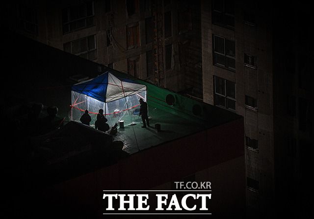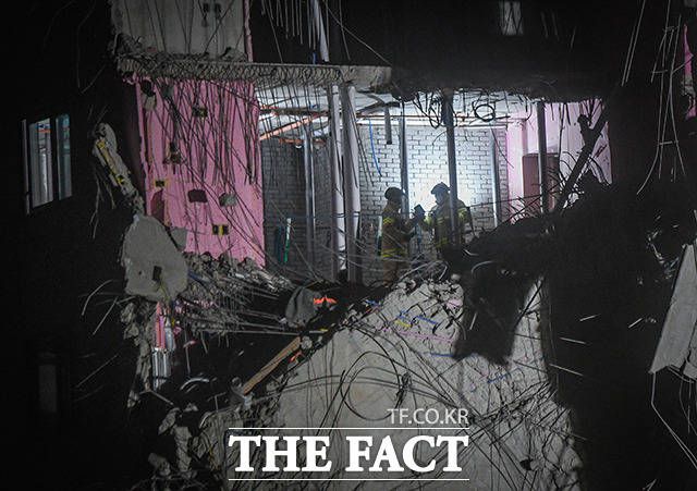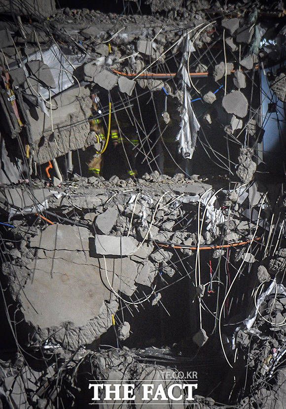 [더팩트ㅣ광주=이동률 기자] 26일 오후 광주광역시 서구 화정동 HDC현대산업개발 아이파크 아파트 신축공사 붕괴사고 현장에서 소방 관계자들이 야간 수색작업을 하고 있다.