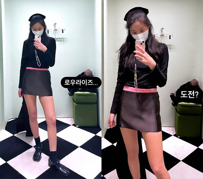 설현은 26일 자신의 인스타그램 스토리를 통해 사진 2장을 공개했다. 설현은 탈의실에서 초미니 의상을 입은 사진에 "로우라이즈 도전?"이라는 글을 덧붙였다.