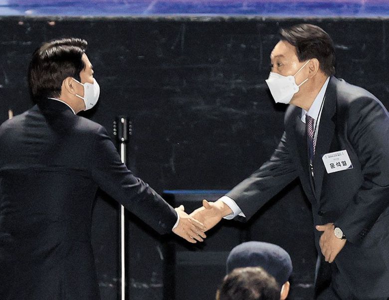 국민의힘 윤석열 후보(오른쪽)와 국민의당 안철수 후보(왼쪽)가 25일 서울 송파구 올림픽공원에서 열린 2022년 베이징 동계 올림픽 대회 대한민국 선수단 결단식에서 만나 악수를 하고 있다. /뉴스1