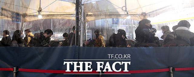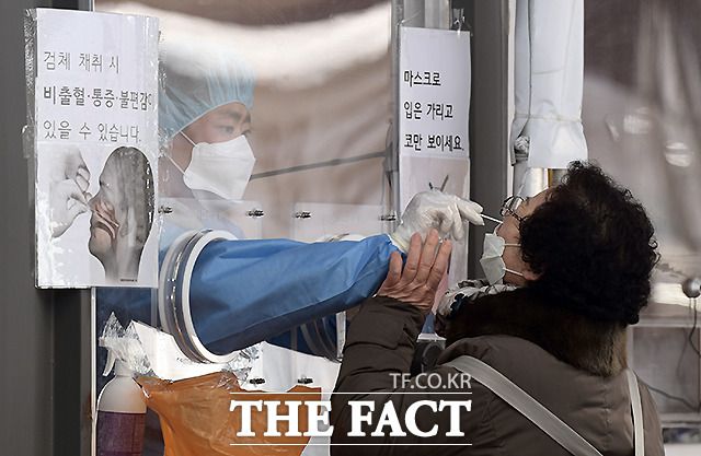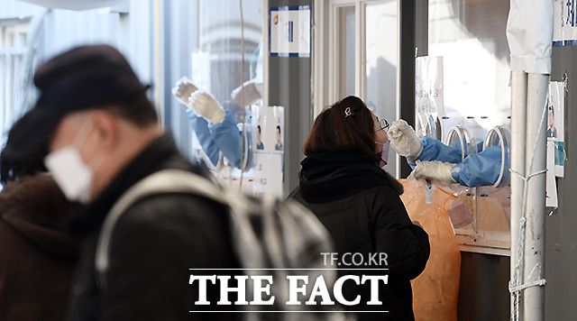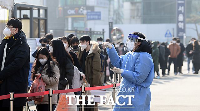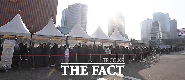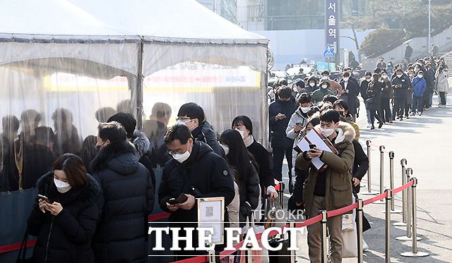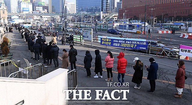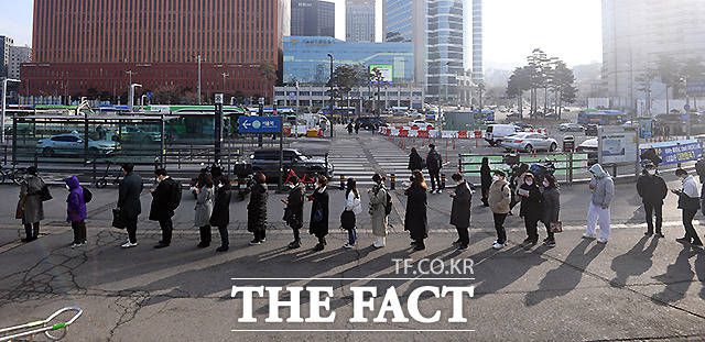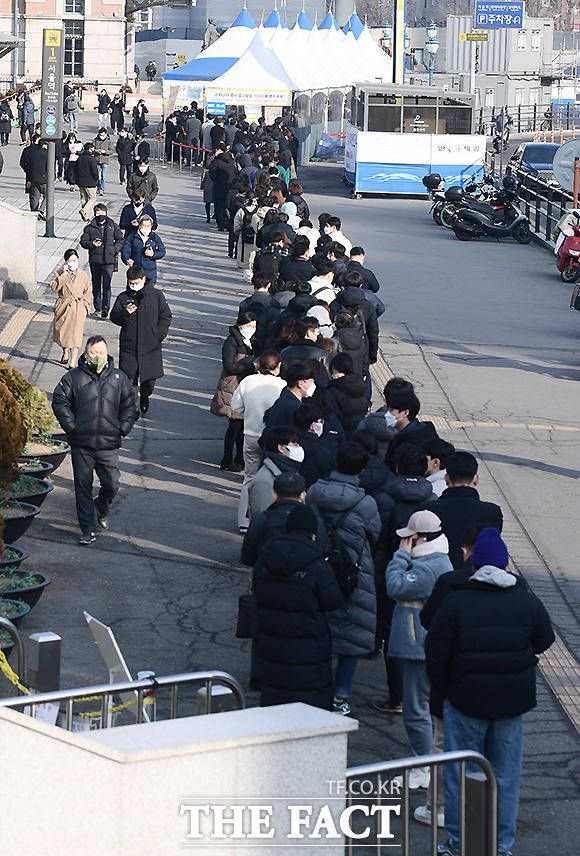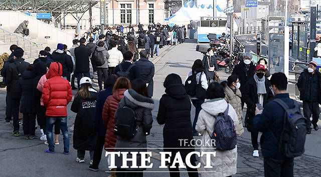 [더팩트ㅣ이새롬 기자] 코로나19 신규 확진자가 1만 4518명으로 집계된 27일 오전 서울 중구 서울역 광장 임시선별검사소를 찾은 시민들이 검사를 받기 위해 길게 줄 서 있다.