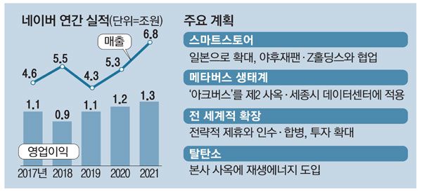매출 증가는 웹툰, 스노우, 제페토를 비롯한 콘텐츠 사업이 이끌었다. 지난해 콘텐츠 사업 매출은 전년 동기 대비 67.9% 성장했다. 박상진 네이버 최고재무책임자(CFO)는 "웹툰은 전년 대비 60% 이상 매출이 성장했고, 스노우는 카메라 부문 매출 수익화와 제페토 매출 급성장세로 전년 대비 130% 이상 성장했다"고 밝혔다. 제페토 월간활성이용자수(MAU)는 전년보다 57% 성장했고 매출은 318% 증가했다. 한성숙 네이버 대표는 "아시아 1위 메타버스 서비스로 생태계를 확장하고 있다"면서 "미국과 홍콩을 거점으로 서비스 확장을 위한 인재 확보와 국제 생태계 강화에 집중할 계획"이라고 밝혔다. 네이버웹툰은 작년 4분기 해외 연간 거래액 1조원을 돌파하며 성장세를 이어갔다.
