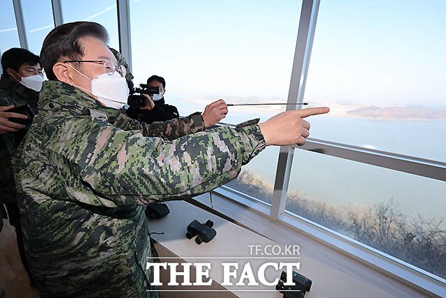[더팩트ㅣ이새롬 기자] 이재명 더불어민주당 대선 후보가 28일 경기도 김포시 애기봉평화생태공원 해병대 2사단을 방문해 군 경계 태세를 점검하고 있다.