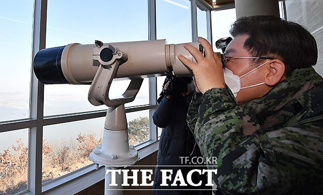 이 후보가 망원경으로 북한 지역 군 경계를 살피고 있다.