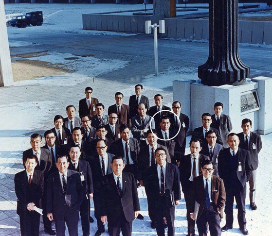 한국과학기술연구원(KIST) 설립초기의 주역들. 앞줄 중앙이 당시 최형섭소장, 성기수, 전무식, 채영복, 양재현, 정만영, 윤영경, 김은영, 윤용구박사와 작고한 장경택, 최상, 정원, 현경호, 천병두박사의 모습도 보인다. 원 안이 김재관 박사. [중앙포토]