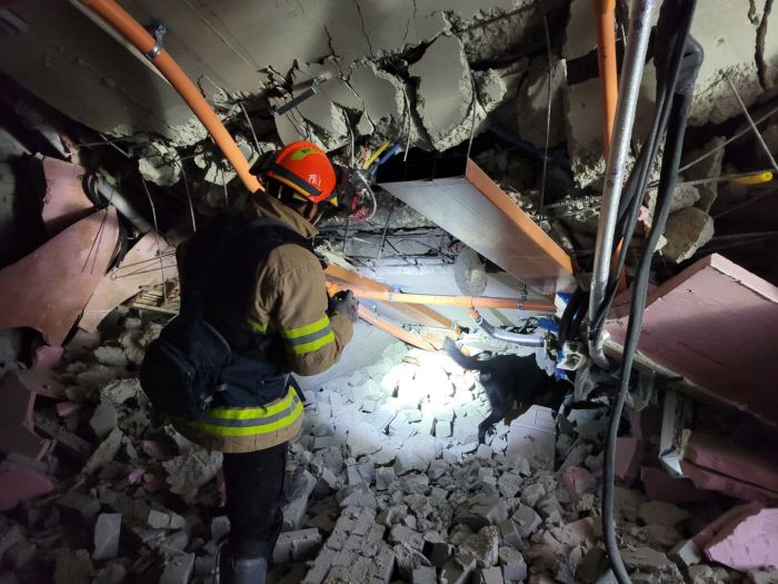 광주 서구 화정 아이파크 붕괴 현장에 투입된 구조대원과 구조견이 무너진 건물 내부를 수색하고 있다. 소방청 제공.