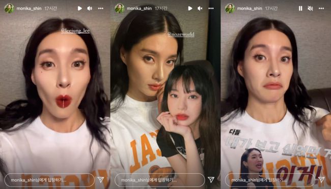 모니카는 7일 자신의 인스타그램 스토리에 “네 제가 그랬고요. 이건 리정이 필터고요. 리정이는 필터도 있고요”라고 말하는 영상을 올렸다. 영상 속 그는 리정의 드레이드마크인 붉은 입술과 피어싱 필터를 활용해 그를 흉내내고 있다.
