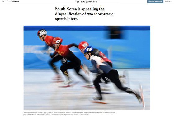 뉴욕타임스 등 주요 외신은 베이징 올림픽 쇼트트랙 경기에서의 잇따른 판정 논란을 심도있게 보도했다. [뉴욕타임스 홈페이지 캡처] |