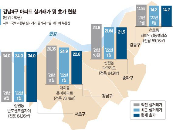 지난주 보합을 유지했던 송파구의 아파트 값은 이번주 0.02% 하락하며 강남3구에서 처음으로 하락 전환됐다. 송파구 아파트 값이 하락한 것은 2020년 6월 1일(-0.03%) 이후 1년8개월 만이다. 강남구 대치동 은마아파트 76.79㎡는 지난해 11월 26억3500만원에서 지난달 24억9000만원으로 하락 거래가 나왔다. 현재 호가는 2억원 정도 더 떨어진 22억8000만원이다.