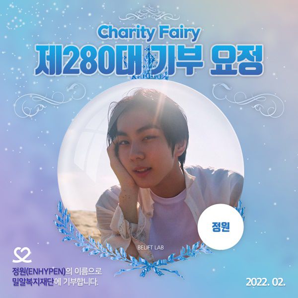 ‘최애돌’은 최근 30일 동안의 누적 순위를 환산해 1위를 달성하면 기부천사, 각종 기념일에 5555만5555표 이상을 달성하면 기부요정으로 선정해 기부하고 있다. 제280대 기부요정이 된 정원의 이름으로 밀알복지재단에 전달될 기부금은 코로나19로 고립된 장애인을 위한 기금으로 쓰인다. ‘최애돌’ 총 누적 기부금액은 3억700만 원에 달한다.