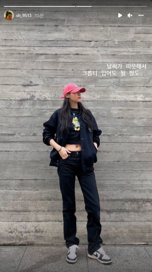 설현은 11일 자신의 SNS 스토리에 “날씨가 따뜻해서 크롭티 입어도 될 정도”라며 사진을 게재했다.