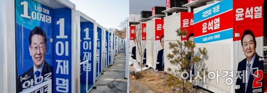제20대 대통령선거를 한달여 앞둔 8일 경기도 김포 차량광고업체 에바다와 파주 미디어맥스에서 이재명 더불어민주당 대선후보와 윤석열 국민의힘 대선후보 선거유세에 사용될 연단이 제작되고 있다./김포=강진형 기자aymsdream@ |