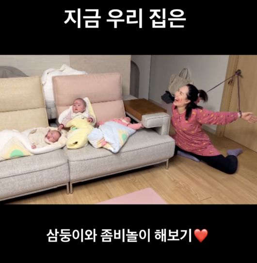 공개된 영상 속엔 거실 소파에 인형처럼 누워있는 삼둥이와 그 옆 문고리에 줄을 매달아 두 손이 묶인 채 좀비를 연기하고 있는 황신영의 모습이 보인다. 황신영은 이 영상을 '지금 우리 집은'이라고 이름지으며 넷플릭스 오리지널 드라마 '지금 우리 학교는'을 패러디했음을 밝혔다.
