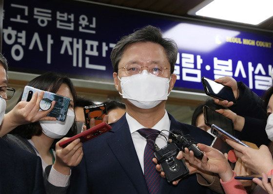 우병우 전 청와대 민정수석이 서울고등법원에서 열린 국회에서의증언·감정등에관한법률위반 등 항소심 선고공판에서 징역 1년을 선고 받은 후 법정을 나와 취재진과 인터뷰하고 있다.2021.2.4/뉴스1