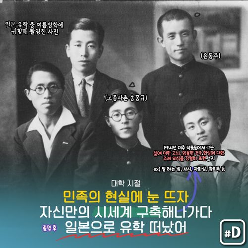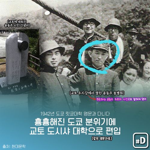 연희전문학교를 졸업한 뒤 일본으로 유학을 떠났는데요. 1942년 일본 도쿄 릿쿄대학 영문과를 다니다가 흉흉해진 도쿄 분위기를 피해 교토 도시샤대학 영문과로 편입했습니다.