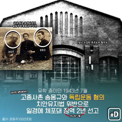 윤동주는 유학중이던 1943년 7월 조선인 유학생이자 고종사촌인 송몽규와 함께 독립운동을 했다는 혐의(치안유지법 위반)로 일본 경찰에 체포됐습니다.