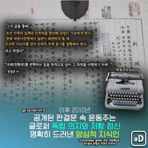 2010년 윤동주의 재판 판결문이 공개됐는데요. 판결문에는 그가 '조선 민족의 실력과 민족성을 향상해 독립이 가능하게 한다.', '장래 대동아전쟁에서 일본이 패전하게 될 때 우수한 지도자를 얻어 민족적 무력 봉기를 결행해야 한다.'라고 하는 등 글에서 독립 의지와 저항 정신을 명확히 드러낸 것으로 돼 있습니다.
