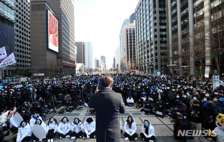 [서울=뉴시스] 국회사진기자단 = 이재명 더불어민주당 대선 후보가 17일 서울 청계광장에서 유세를 열고 지지를 호소하고 있다. 2022.02.17. photo@newsis.com |
