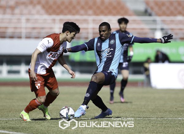 0-1로 뒤진 안산은 공격적으로 경기를 운영했다. 전반 31분 동점골이 터졌다. 티아고의 발끝에서 공격이 시작됐고, 두아르테의 침투 패스에 이은 최건주의 오른발 슈팅이 골망 구석에 꽂혔다.