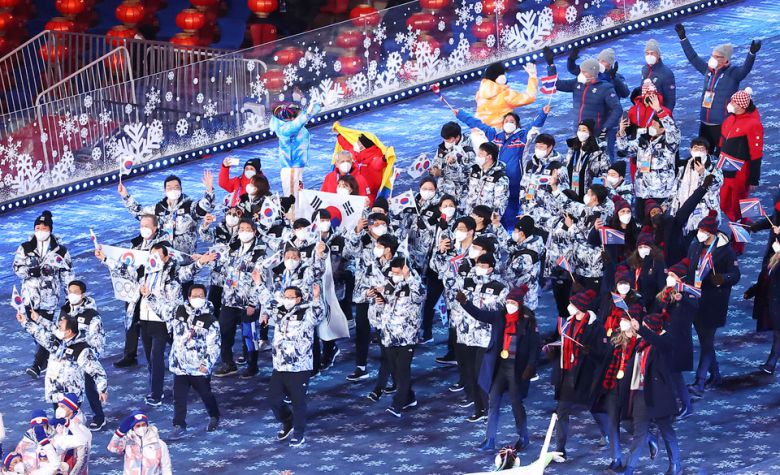 태극기 들고 폐회식 입장하는 대한민국 선수단. 20일 중국 베이징 국립경기장에서 열린 2022 베이징 동계올림픽 폐회식에서 대한민국 선수단이 입장하고 있다. (베이징=연합뉴스) |