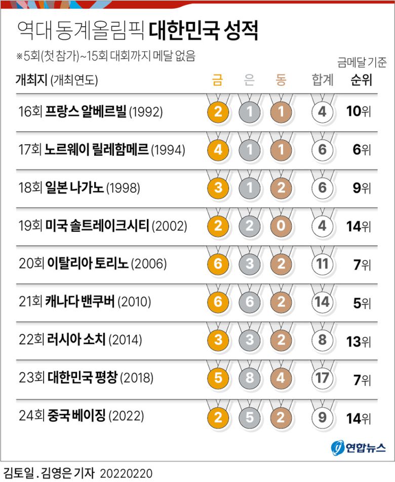 1992년 대회 이후 한국의 최저 순위는 2002년 솔트레이크 대회(14위)였는 데 이번 베이징 대회에서도 14위에 랭크됐다.