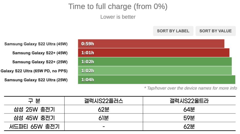 배터리 잔량 0%에서 완충까지 걸린 시간을 측정한 결과 갤럭시S22플러스는 25W 충전기로 62분, 45W 충전기로는 61분이 소모되었다.