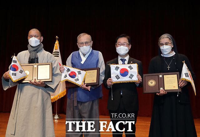 24일 오후 경기도 과천 법무부 청사에서 특별공로자 국적 증서 수여식이 열린 가운데 박범계 법무부 장관(왼쪽에서 세 번째)과 특별공로자들이 기념촬영을 하고 있다. 왼쪽부터 타망 다와 치링 스님(법명 설래), 웬트워스 주니어 웨슬리 존 선교사(한국명 원이삼), 박 장관, 갈 크리스티나 에벨리나 수녀. /법무부 제공