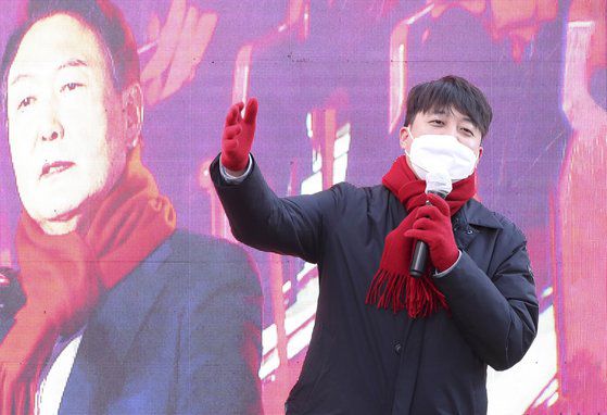 이준석 국민의힘 대표가 23일 강원 춘천시 명동거리에서 윤석열 후보에 대한 지지를 시민들에게 호소하고 있다. 연합뉴스 |