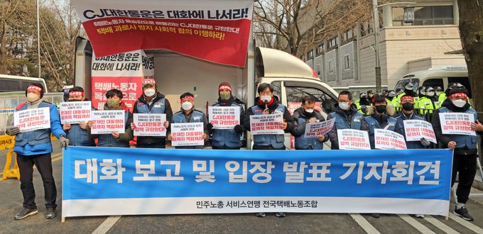 민주노총 전국택배노동조합 조합원들이 25일 서울시 청와대 앞에서 CJ대한통운 택배 대리점연합회와의 협상결과 기자회견을 하고 있다. 택배노조는 대리점연합회와의 협상 타결을 위해 '부속합의서' 문제를 놓고 대화했으나 '쟁의행위 금지 및 대체 배송' 등의 조건으로 대화가 중단됐다며 CJ대한통운을 규탄했다.   뉴스1