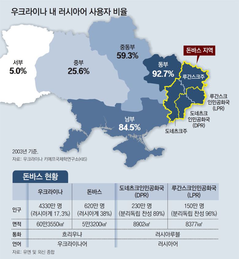 이곳이 유럽의 화약고가 된 이유는 우크라이나 내 타 지역에 비해 월등히 높은 러시아어 화자 및 러시아계 주민 비율 때문이다. 우크라이나 전체의 러시아계 주민 비율은 17.3%다. 마지막 공식 자료인 2001년 우크라이나 인구조사에 따르면 돈바스 주민의 약 38.6%가 러시아계로 우크라이나 전체 비율보다 2배 이상 높다. 또 전체 주민의 약 70%는 러시아어를 모국어로 사용한다. 즉 러시아계가 아닌 수많은 우크라이나인조차 제1언어로는 러시아어를 쓸 정도로 러시아화가 진행됐다.