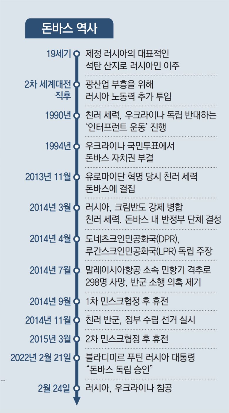돈바스의 친러 세력은 우크라이나의 독립 직전인 1990년에도 독립을 반대하는 ‘인터프런트 운동’을 벌였다. 1994, 2004년에도 자치권을 요구하며 결집했지만 당시에는 뜻을 이루지 못했다.