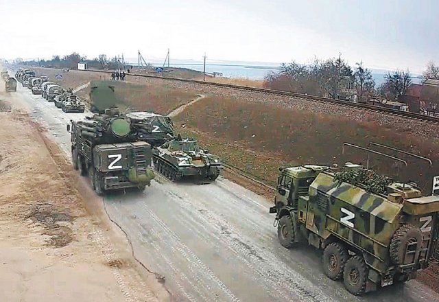 25일(현지 시간) 우크라이나 동부 돈바스를 관통하는 드네프르강 인근 고속도로에서 흰색으로 알파벳 ‘Z’가 선명하게 새겨진 군용  트럭이 줄지어 이동하고 있다. Z 마크는 러시아군이 아군을 식별하기 위해 사용하는 표시로 알려져 있다. 돈바스 내 친러 반군이  설립한 도네츠크인민공화국과 루간스크인민공화국은 러시아의 우크라이나 침공 또한 자신들과 러시아의 합병을 위한 ‘Z 작전’으로  규정하고 있다. 트위터 화면 캡처