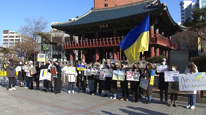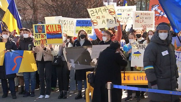 이들은 전쟁을 멈추라는 러시아어 구호를 외치며 한국 정부가 러시아의 침공에 제동을 걸어달라고 촉구했습니다.